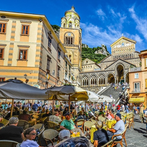Set off to discover Campania's magnificent coast! Start in Sorrento and travel by minivan to Nerano. Take a boat ride around Isola de li Galli, where the myth of Ulysses and the Sirens comes to life. Arrive near Amalfi, where you will enjoy about 3.5 hours of free time to visit local attractions on your own, like the Cathedral and the Cloister of Paradiso. For those interested, you can choose to visit beautiful Ravello, about a 20-minute drive away, famous for Villa Rufolo and its gardens. Return onboard, sailing to Positano, with a planned stop of about 1.5 hours. While sailing to Positano, admire the picturesque Fiordo di Furore and the magnificent village of Praiano. On the return trip, encounter the Fiord of Crapolla and the enchanting Isolotto d'Isca by Eduardo de Filippo. Return to the port of Nerano, where you will take the minivan back to Sorrento.