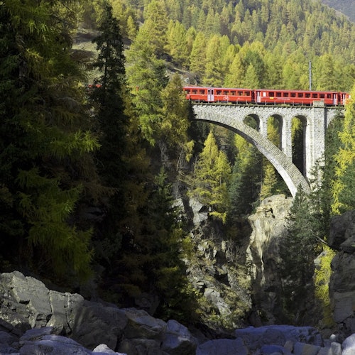 Embark on a picturesque railway journey from Milan to Switzerland, where you'll travel on the UNESCO World Heritage Bernina and Albula railways. Starting in Chur, the oldest town in Switzerland, surrounded by the Swiss Alps, you'll enjoy stunning mountain vistas and quaint alpine villages. On the Albula Line, part of the Glacier Express route, marvel at the engineering feats and breathtaking landscapes as you pass through lush valleys and charming Swiss villages. Ascend through the Albula Pass for panoramic views of the mountains and forests, and cross the iconic Landwasser Viaduct with its distinctive curved design, spanning a deep gorge.