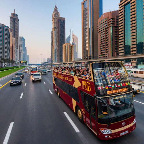 **Dubai** Hop on an open-top, double-decker bus to explore Dubai's charm. Admire the Burj Khalifa, the luxurious Burj Al Arab, and the stunning Atlantis the Palm. Be awe-struck by the Museum of the Future, a masterpiece of Arabian calligraphy-inspired architecture. Enjoy a narrated tour of 25+ locations across the city via two captivating routes: the city tour and the beach tour. Sit back, relax, and watch history unfold as a traditional wooden dhow boat sails through the historic Dubai Creek. With entertaining commentary, iconic sights like Al Fahidi Fort come alive. The crew is ready with refreshing treats. **Abu Dhabi** Discover history and modernity on a 48-hour hop-on, hop-off bus tour in Abu Dhabi. Jump aboard and witness the grandeur of the Presidential Palace, the lavish Emirates Palace, the cultural haven of Heritage Village, the renowned Louvre Abu Dhabi Museum, and more.