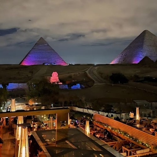 Begin your evening at The Great Pyramid Inn with a hotel pickup from Cairo or Giza. Have a dinner that includes a main course, dessert, a soft drink, and bottled water. Get views of the Giza Pyramids from your seating area. If the Sound and Light Show is running, it can be seen from your table. The evening ends with a transfer back to your hotel.