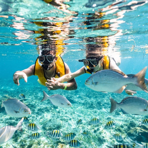 Go on a snorkeling tour with turtles, reef, MUSA statues, shipwreck, and cenote