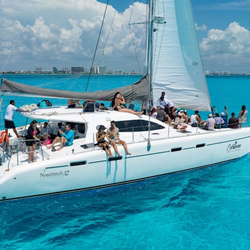 Sail for 8 hours on a shared catamaran from Playa Tortugas. Snorkel at El Meco Reef with its coral formations and marine life. Relax at Playa Norte, swim in its clear waters. Visit Isla Mujeres for a buffet lunch and drinks at a beach club, or see local landmarks. End the day sailing back to Cancun with drinks from the open bar and a view of the Caribbean sunset.