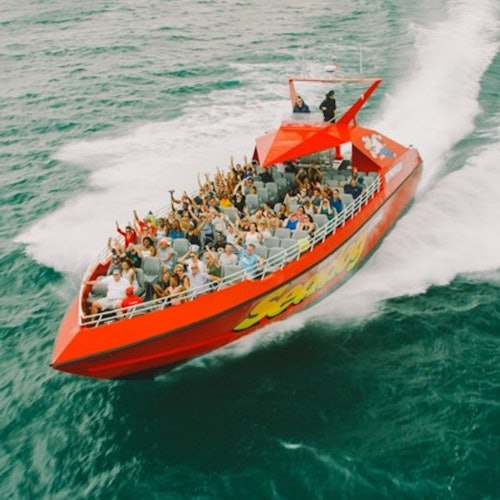 With exhilarating high speeds and full 360° spins, get ready to blast off on the jet-propelled Chicago Seadog Extreme Thrill Ride. Experience full-throttle slalom runs, sharp twists and turns, and crashing waves while your speedboat tour takes you around Lake Michigan. Dress appropriately – getting wet is a guarantee! The enthusiastic and expert crew tells the story of the Windy City as you zoom past some of Chicago's most iconic sites, like the Willis Tower, Buckingham Fountain, and Grant Park. Perfect for thrill-seekers 48" and taller, this speedboat tour will activate your need for speed.