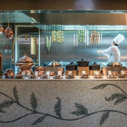Experience the magic of dining at Dubai's one of the famous restaurants, Palazzo Versace, where vast, open spaces meet the allure of unique mosaic patterns. Live cooking displays, various international cuisines, and the artful adornments on walls and pillars catch the eye and stir the imagination.