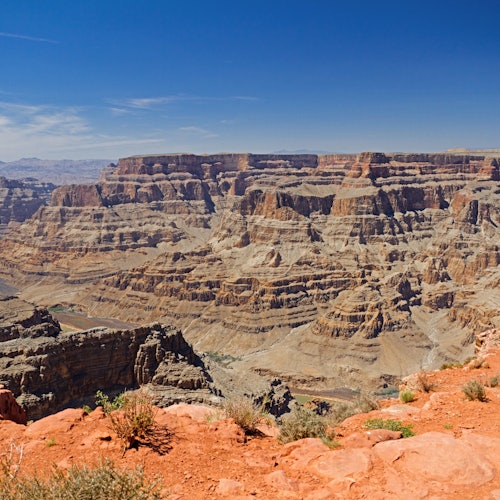 This unforgettable air tour takes you on an exhilarating journey through the West Rim of the Grand Canyon, located within the Hualapai Indian Nation. Your helicopter is equipped with air conditioning, oversized windows, and noise-canceling headphones, ensuring the best flying experience possible. Choose your language of choice and enjoy narration and music during your flight. You'll witness stunning views of Lake Mead, the Hoover Dam, the vast Mojave Desert, and the Grand Wash Cliffs on your way to the canyon. As you approach the West Rim, prepare to be amazed by the colossal striped stone walls, a natural wonder that has rendered many people totally breathless! As you fly over the West Rim, you'll be treated to a truly inspiring work of nature!