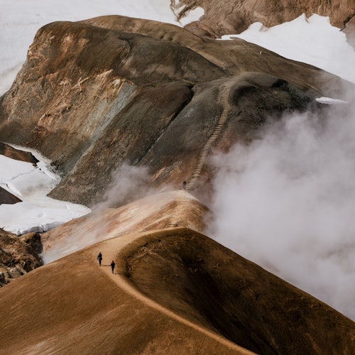 Depart from Reykjavík by bus at 08:30 and head to Gullfoss on the way to the highlands. Sit back and take in the icy rivers and snowy peaks. Arrive in Kerlingarfjöll and take a bus to Hveradalir. A guide will show you the area, known for active hot springs and colorful rock formations. Hveradalir presents contrasts against the mountain backdrop. After your hike, reserve a table at the restaurant (at your own expense) to rest and eat. Visit the Highland Baths to relax in geothermal waters surrounded by the landscape.