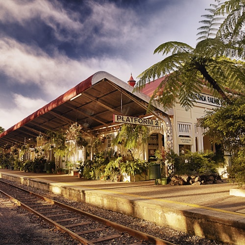 For well over 100 years, the Kuranda Scenic Railway has been meandering through the World Heritage-listed rainforest in Barron Gorge National Park, to the picturesque mountainside village of Kuranda. Get your Kuranda Scenic Railway tickets and experience this iconic train ride, passing over endless bridges and ravines towards Kuranda. Your adventure begins at Cairns or Freshwater Station, and you'll chug along the 33-kilometre route through lush green valleys and past gushing waterfalls. If you opt for the Gold Class ticket, you'll enjoy drinks and locally sourced appetizers, as well as a dedicated host for your Kuranda train journey.