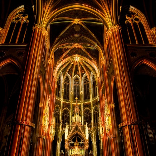 Watch Light of Creation, a 30-minute light show at Vienna's Votivkirche inspired by Genesis. This program uses advanced technology to tell the ancient story in the church surrounded by historical architecture. See the creation of the universe in six acts: light's appearance to life's growth. Projection technology changes the church with light, color, and sound. Listen to music composed for the show, from the sounds of the Big Bang to key moments. Note the mix of old architecture with modern tech.