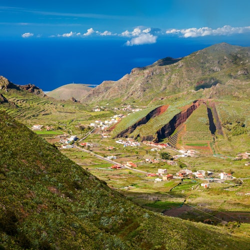 Begin the route at Las Portelas, a rural area in the El Palmar valley, located in Teno Rural Park. Walk through laurel forests in the mountains, with views of the valley below. Reach the peak and follow the trail along the Teno massif ridges. See the Atlantic Ocean and La Gomera island. Continue to Mirador de Cruz de Hilda for views of Masca village, situated among cliffs. Finish with a descent to the village, known for its traditional architecture and history. Discover its unique character, making it one of Tenerife's notable locations.