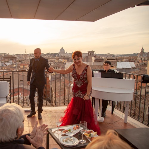 Attend an opera concert featuring top works by Verdi, Puccini, Rossini, and Bellini on the rooftop "La Grande Bellezza" in Palazzo Pamphilj. This recently opened terrace offers a 360-degree view of Rome, from the Pamphilj Palace to Piazza Navona. Scenes from the Oscar-winning film "The Great Beauty" were filmed here. You will enjoy an exclusive rooftop event in this prestigious location. An aperitif will be served, including a choice of white or red wine or non-alcoholic drinks. You can also choose from a rich selection of Italian cheese, cold meats, and sparkling wine for a final toast with the artists.