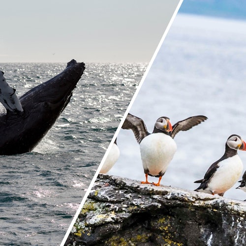 Observe puffins with striking beaks and their behavior from the specially designed vessel, Skúlaskeið (“Old Skúli”). Get close to these birds as the vessel navigates the shallow waters near their nesting grounds. Whether floating on the waves or flying overhead, you'll get to see puffins in their natural habitat. Enjoy comfortable overalls, spacious heated indoor cabins, a bar, and complimentary WiFi during the trip.