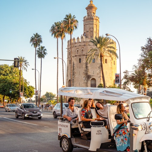 With this tour, you won't be wasting time struggling to get from one place to another, simply put your hair up and get ready to tuk-tuk your way through Seville. Witness Seville's iconic landmarks close-up, from the glittering Spanish Square and the stately San Telmo Palace, to the charming America Square. After a trip to the Triana Bridge and Real Maestranza, the adventure ends with a tranquil ride through the verdant Maria Luisa Park.