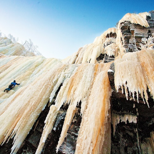 Walk in a Finnish winter wonderland on this **hiking tour** to see the **Frozen Waterfalls of Korouoma**, complete with **roundtrip transport** from your hotel in the Rovaniemi city center. With the sparkling snow and frosted trees as your backdrop, you and your **expert guide** will hike (or snowshoe) toward the breathtaking waterfalls located in **Korouoma National Park**. Pause to warm up near a campfire and enjoy **Lappish barbeque** paired with **warm blueberry tea** for a winter adventure to remember.