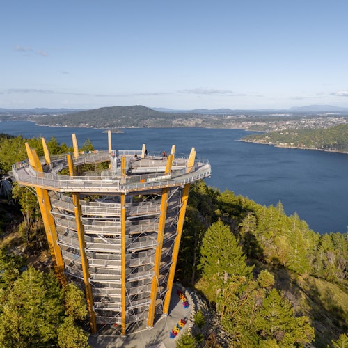 Witness some of Vancouver Island's best views at the Malahat SkyWalk, just a short drive from downtown Victoria. Situated atop a lush mountain overlooking the Salish Sea, it offers unparalleled access to nature's beauty. Previously, this kind of adventure was limited to the most agile explorers. Now, with the Malahat TreeWalk and Spiral Tower, everyone can enjoy it, including those with strollers or wheelchairs. Ascend the spiral ramp to reach new heights of adventure. Standing 250 meters above sea level, the tower provides incredible views of Vancouver Island, including Mt. Baker, Finlayson Arm, the Saanich Peninsula, and neighboring islands. Explore the West Coast from a whole new perspective, and when you're ready to come down, choose between a leisurely walk down the ramp or an exciting descent on the Spiral Slide.