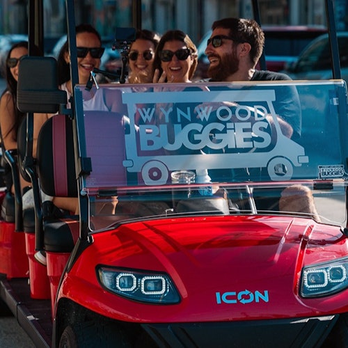 Explore Goldman Properties' influence in Wynwood, featuring amazing artwork and architecture. Ride through the neighborhood in a street buggy, blending into the vibrant Wynwood scene. Visit stunning murals, offering a glimpse into the cultural Renaissance, powered by the Goldman Global Arts legacy. Each buggy, seating up to 7 passengers, offers a guided tour with a local artist, adding to the artistic atmosphere with its colorful design.