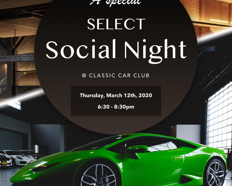 We don't take things slow - which is why we are going full speed ahead with our newest SELECT partner, Classic Car Club. And what better way to begin this relationship than by kicking it off with a SELECT Social Night! Join your fellow members and their guests at Classic Car Club's showroom at Pier 76 overlooking the Hudson, on Thursday, March 12, at 6:30 pm.