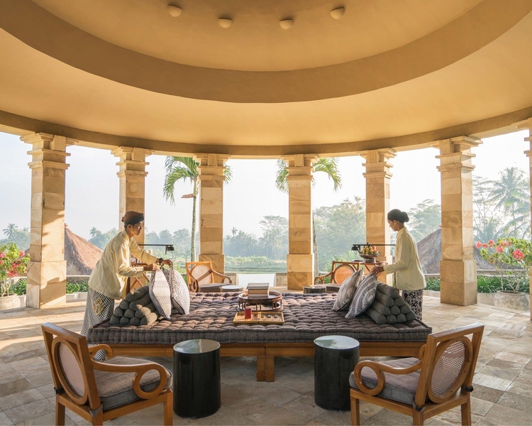 Framed by emerald-green rice plains and the peaks of the Menoreh Hills in rural Central Java Amanjiwo lies within view of the mystical stupas of Borobudur - a Unesco World Heritage Site. The Buddhist monument directly informs the design of Amanjiwo a temple-like hideaway with a towering domed roof colonnades and walls built of local blush-beige paras stone. Intersperse days of sightseeing - at serene Borobudur bustling Yogyakarta or any number of vibrant villages - with spells of relaxation at Amanjiwos spa 40-metre pool and romantic open-air restaurant. The Spas treatments include Mandi Lulur a centuries-old wedding day body-polishing ritual for Javanese royalty. The Restaurant with a silver-leaf ceiling and views of Borobudur and volcanoes serves Indonesian and Western cuisine. Amanjiwos setting suits all manner of events which can be complemented by Javanese folk dances and music.