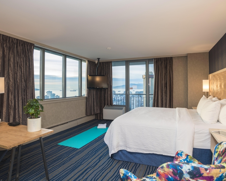 Exciting Changes are happening. Our Guest Bathrooms are being transformed to have new walk in showers replacing bathtubs LED lighting and state of the art plumbing fixtures with an expected completion date of March.31 2017.The Blue Horizon offers good value and friendly service. Every room is a corner room with a balcony and many have spectacular views. Located right on Robson Street with shops and restaurants at your doorstep. 100 percent non-smoking hotel and 4 Green Key Eco-Rated. Free wireless Internet access in all guest rooms and throughout the hotel. Our new lobby restaurant ABODE for breakfast and lunch and dinner with a summer sidewalk patio. An indoor heated pool and Jacuzzi and sauna and exercise equipment. The banquet facilities on the 31st floor offer space from 4 to 100 persons and have million dollar views of English Bay and Vancouver and mountains.