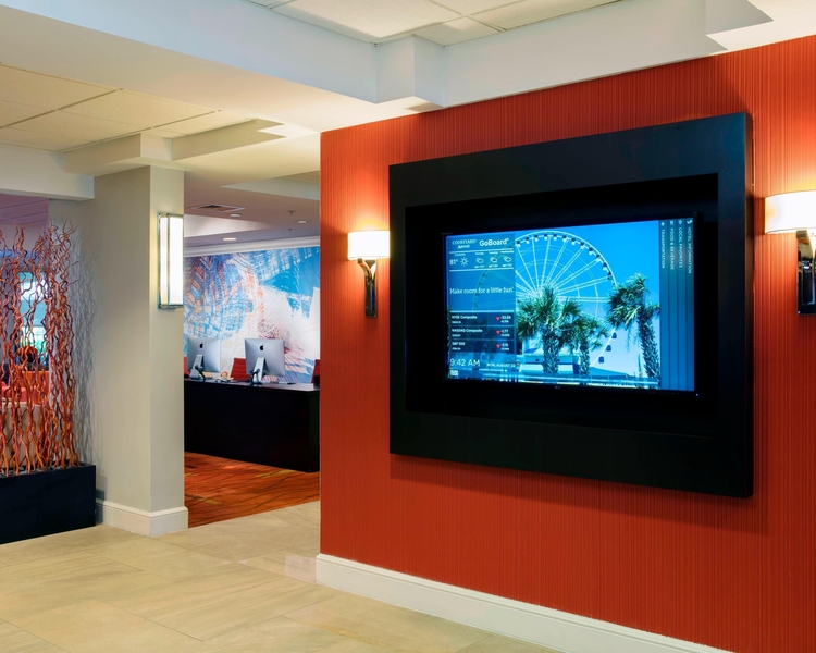 Revitalize your hotel experience at Courtyard Myrtle Beach Barefoot Landing. With a central location in North Myrtle Beach, South Carolina, our hotel makes it easy to enjoy the sunny sights and shops of Barefoot Landing or catch a concert at House of Blues Myrtle Beach. After a fun-filled day in Myrtle Beach, retire to our rooms and suites complete with plush beds and stylish decor. Hotel accommodations include high-speed Wi-Fi, flat-panel TVs and ergonomic workstations. In the morning, enjoy a fulfilling breakfast and Starbucks® coffee at our on-site restaurant, The Bistro. Join us again in the evening for a delightful cocktail and satisfying dinner. Run, swim or lift during your stay with our indoor pool and well-managed fitness center. Our hotel also offers a spacious venue, perfect for meetings and parties in North Myrtle Beach. Whether in South Carolina for business or leisure, Courtyard Myrtle Beach Barefoot Landing makes travel plans less complicated and more effortless.