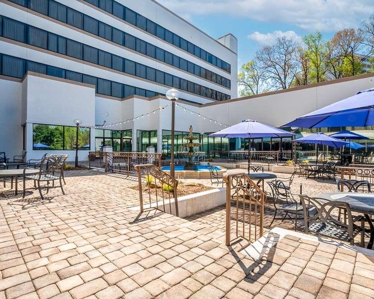 - We re just off I-77 15 minutes from Charlotte Douglas International Airport via free shuttle. Uptown Charlotte attractions are less than seven miles away. Easy interstate access makes us the ideal stopover on the way to destinations like Greenville Myrtle Beach Blowing Rock and Florida. Enjoy our seasonal outdoor pool tranquil courtyard and fitness center. Relax in our well-appointed guest rooms that feature large work desks with complimentary wireless Internet access flat-screen TVs room service. You will know you ve entered the South with our Southern inspired menu at Southern Twist Restaurant and Lounge a side of sweet Southern Hospitality is free. Whether you are gathering for work or celebrate a special occasion the Hilton Charlotte Executive Park has the right space to best fit your needs. From boardrooms to ballrooms our on-site professional will make planning a breeze. Go stay work or play in spaces made to fit your needs.