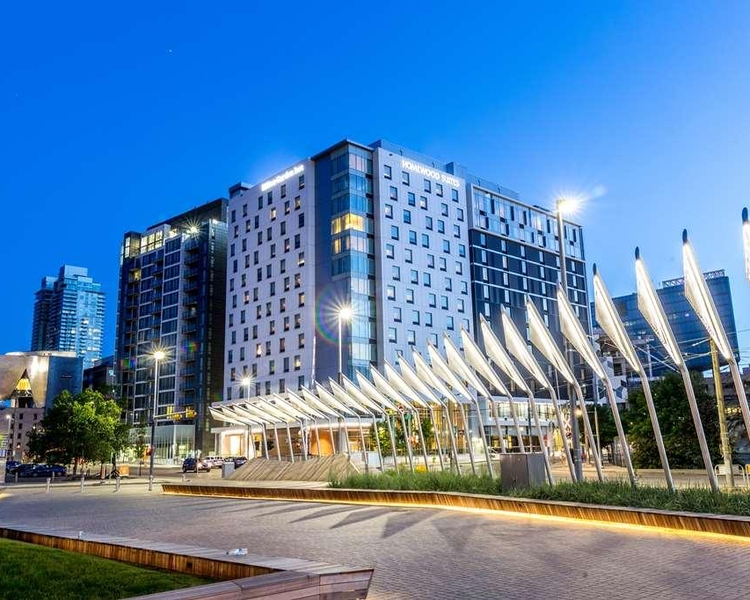 - Daily Mandatory Charge will be added to the room rate and includes: Destination Marketing FeeDaily Mandatory Charge will be added to the room rate and includes: Destination Marketing Fee The new Hilton Garden Inn Calgary Downtown hotel is set in trendy East Village just steps from Calgary s business district city agencies and beautiful urban parks. Take the RiverWalk pathway to restaurants playgrounds and event plazas and discover the popular St. Patrick s Island. Scotiabank Saddledome and the National Music Centre are just 1 kilometer away. You ll find plenty of downtown Calgary dining options at the hotel. Enjoy breakfast lunch and dinner at our restaurant and bar or order off the room service menu. The Pavilion Pantry is open 24 hours for any snack and drink cravings. Long day at work Re-energize in the fitness center or unwind in the indoor pool and whirlpool with gorgeous city views. Our Calgary AB hotel also has a rooftop terrace that overlooks the Rocky Mountains. Host an event for 300 guests in over 4 000 sq. ft. of meeting space and work smart in our Business Center.
