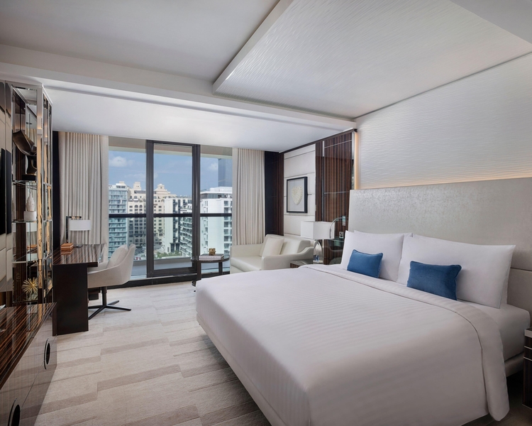 Located on the beach of the iconic Palm Jumeirah, the first Marriott Resort in Dubai offers the best of both worlds, catering to both the leisure seeking and dynamic business traveler. With the convenient conjunction to Dubais Sheikh Zayed Road, connecting the downtown area and the Burj Khalifa with the main shopping malls and business districts, the resort is the ideal starting point to explore all that Dubai has to offer. Our rooms have private balconies and offer deluxe bedding, complimentary Wi-Fi and 24-hour room service. Enjoy a swim in the resorts beachside pool, workout in the fitness centre or relax at the Saray Spa. Young travelers can enjoy their own space at the Kids Club. The resort has 10 restaurants which include Korean, Italian, Japanese and Mexican cuisines. In front of the resort is the Palm West Beach promenade where guests can relax on the resorts private beach, swim or enjoy water sports in the waters of the Arabian Gulf, explore the restaurants along the promenade and more